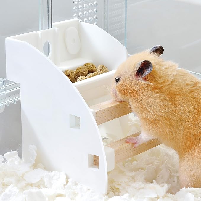 登ってかじってストレス発散!! 簡単に付け替えられる広葉樹のかじり木ステップ。上のお皿にごはんが入れられます。 ●付け替えカンタンかじり木ステップ ●かじりやすい固さの広葉樹 ●ごはんも置ける! ●金属・接着剤不使用 ●差し込むだけでカンタンに交換! ●ケージに固定できる ●低アレルギー素材の広葉樹を使用 ●ワイヤーケージでも使用OKの取り付け器具採用 組立時サイズ:約 幅8.9 奥行き11.4 高さ10.8cm セット内容:完成品1セット、交換用バトン1本 <使い方>本製品を飼育ケージの中に入れ、付属の部品で固定し取り付けてください。●ワイヤーケージに設置●ハムスターが届く位置を確認し、取付け位置を決めてください。バトンを本体にセットします。本体のネジを外し、飼育ケージの内側からはさんで固定してください。中心の穴の使用をおすすめします。※ワイヤーの間隔が25mm以上のものには使用できません。※本製品を設置する場所は、水平が保たれる安定した平面を選んでください。 ●グラスハーモニー(別売)に設置●バトンを本体にセットします。ボトル取付け穴の専用キャップを取り外してください。本体のネジを外し、ケージの内側から凸ネジで本体とスペーサーを一緒にはさみ、外側から凹ネジを回して固定してください。 ※ケージ内に置いて使用することもできます。 ※バトンが短くなったり汚れが目立ち始めたら新しいものに交換してください。(ハーモニーバトン5本入(別売)) ※天然素材のため、形状や木目、木の色の違いがありますので、ご了承ください。