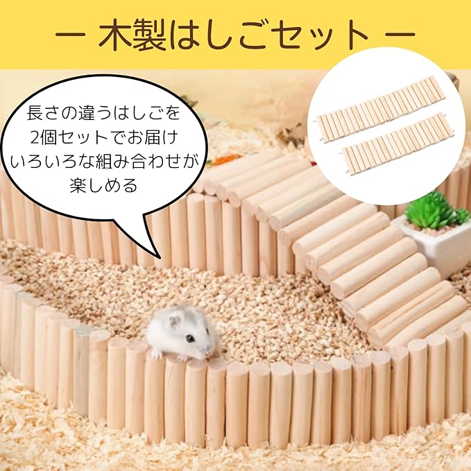 Uccellino はしご 2個セット ハムスター 吊り橋 仕切り 階段 木製 変形 幅8cm チンチラ ブリッジ おもちゃ 【はしご2個セット】ハムスターが喜ぶはしごをサイズ違いの2個セットでお届け!2個セットなので単品でも組み合わせても工夫次第でさまざまな使い方ができます。いろいろためしてペットのツボをみつけてください。 【変形可能】ワイヤーが通っているので、様々な形に変形可能です。階段としてはもちろん、・立てて仕切りとして・輪っかにして砂場に・山型にして隠れ家に・ケージに取り付けて吊り橋に・・・と色々楽しめます。ハムスターのお気に入りはどの使い方かな? 【フック付き】梯子の端にはフックがついているのでケージに取り付けが可能です。はしごとはしごを接続することもできます。 【木製】温かみのある木製なので見た目で癒されます。かじり木として使うハムスターもいますよ。遊んで噛んでストレス発散!運動不足の解消にもなります。 【サイズ】幅8cm 長さ30cm 1 長さ40cm 1 2個セットでお届け。幅8cmなので多くのハムスターにぴったりです。仕切りとしても便利なサイズです。