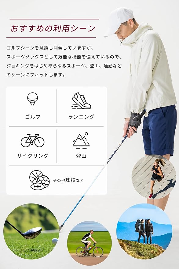 ✅【酷暑でのプレイに欠かせないくるぶしショート丈】全国的に異常な暑さに見舞われる近年、ショートソックスでのプレイが可能な名門コースが増加中。くるぶしまでのショート丈バージョンなら、酷暑の中でも涼しく快適にプレイができます。程よい丈なので、シューズの縁が肌に当たって痛いということもありません。 ※コースに向かう際は、あらかじめドレスコードを確認しておくことをおすすめします。