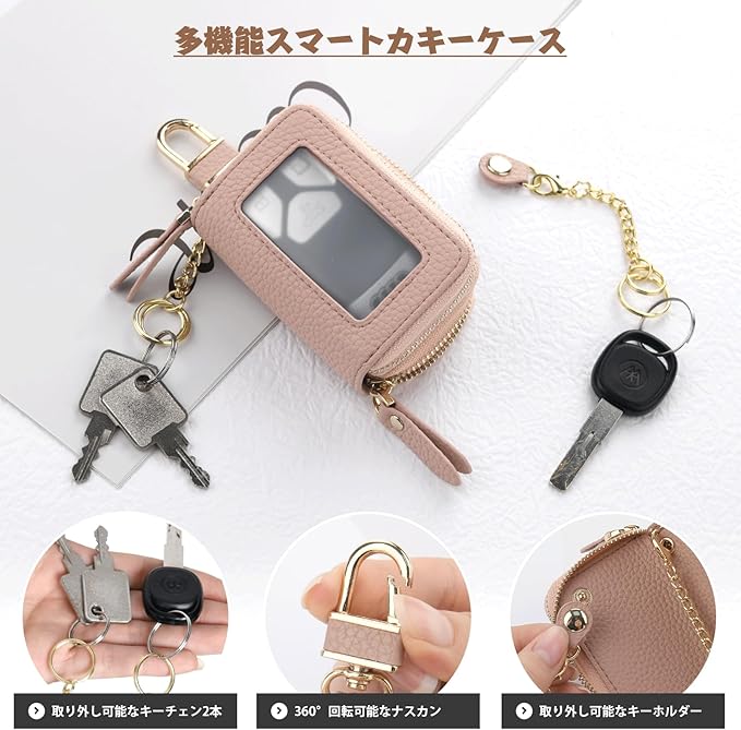 ★【透明な窓付きと360度回転カラビナ】❶一つの仕切りには透明な窓があり、スマートキーを取り出さずに簡単に操作できます。窓はマット素材で作られており、見た目にも上品さを演出します。❷【チェーン付きリング】ケース内にスマートキーを繋ぎとめるチェーンを付き、万が一、ファスナーを閉め忘れた時に、キーの落下を防ぎできます。❸カラビナ付き、ラウンドファスナーで大きく開き、鍵の出し入れがスムーズです。軽量で手のひらに収まる、ほどよいサイズ感の使いやすいキーケースです。360度回転する便利なカラビナ付きで、ズボンやバッグなどにつけることができます。