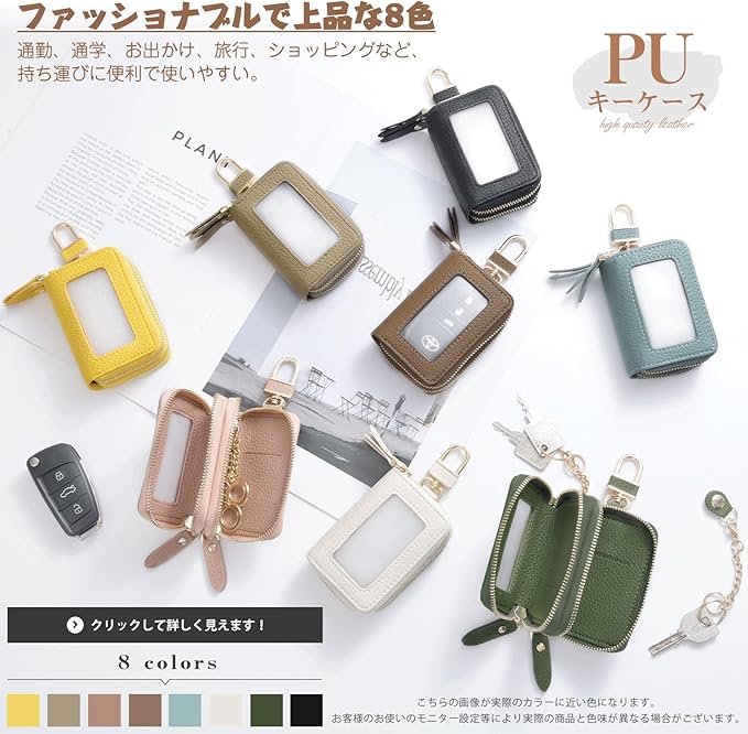 ★【車キーケースの商品仕様】サイズ:長さ10cm 幅6cm 厚さ4cm、重さ約80g。ファスナー付フリーポケットⅹ2、チェーン付きキーリング 2、360 回転カラビナ付き 1。8色展開:ブラック、ライトピンク、エトープ、ライトブルー、ベージュ、ダークグリーン、イエロー、ダークブラウン,カラフルで持つだけで楽しくなるスマートキーケース。スタイリッシュでおしゃれな方のマストアイテム。ならではの高級感、シボ加工で長く持っても傷が目立ちにくいのもうれしいポイントです。車のキーや鍵を簡単に収納でき、コンパクトなデザインでポケットやバッグにすんなりと収まります。 耐久性のある素材で作られ、長時間の使用に耐える美しさと実用性を備えています。