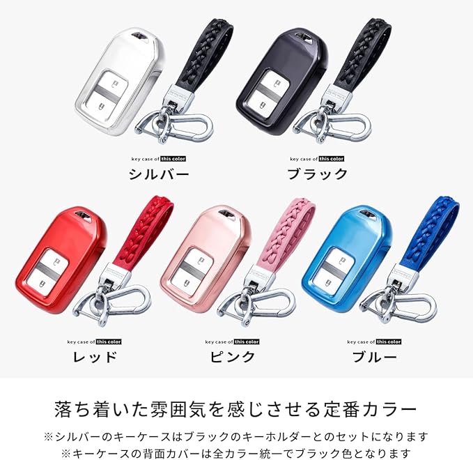 ホンダ製の車種に適合するスマートキーケース+キーホルダーのセット商品です。 光沢仕様で高級感をアップさせてくれます。 シルバー・ブラックの定番からレッドやブルー・ピンクを加えた5色展開。 ※背面カバーは全カラー統一でブラック色となります。 愛車の色に合わせたカラーリングのキーケースにするのもおすすめです! 柔軟なTPU素材のためボタンも押しやすい!全面を保護する仕様のため傷からも守ってくれます。 キー操作の信号を妨げない設計のためカバーをしていても普段通り使用可能です。