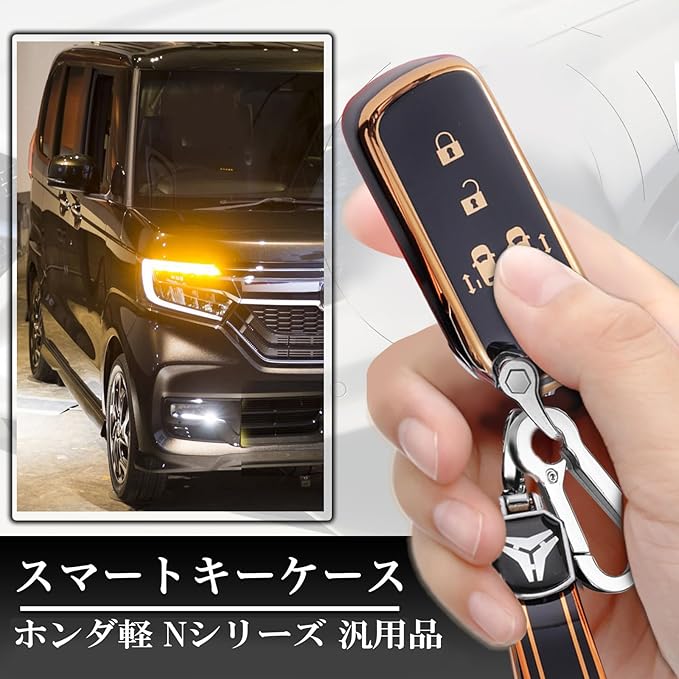 【ホンダN-BOX専用キーカバー】 N-BOXの4ボタンのスマートキーを保護するソフトなキーカバーとストラップのセットです。※新型N-BOX(2024~)には適合しません。 純正スマートキーにはめ込むだけのカンタンドレスアップ!ファッション性の高いデザインでオーナーの個性を際立たせます。 メタリックでクールなキーカバーは愛車のスマートキーを輝かせ、周りの注目を集めます! 【高品質なTPU素材】 高耐久でソフトなTPU素材を使用。落下などの衝撃を緩和し、キズや汚れなどから愛車のスマートキーを守ります。 光沢のある表面は適度なグリップ感があり、滑りにくいため落下のリスクを低減します。 【カンタン取り付け】 純正スマートキーを上下から挟み込むタイプのカンタン取り付けキーカバー。 キー全体をカバー出来るので落下などの衝撃やキズから愛車のスマートキーを全方位で守ります。 古くなったキーのキズ隠しとしても最適のアイテムです。 【カラーバリエーション】 色の種類はホワイト、ブラック、レッド、グリーン、グレーの5色があります。 それぞれに金色の縁取りがアクセントになっています 【適応車種】 N-BOX N-BOXカスタム ( JF1 / JF2 , JF3 / JF4 ) N-BOX+ プラス 2011~2022※新型N-BOXには適合しません。 【ご注意】※商品は新品未使用品ですが、パッケージが輸送や保管の関係上で多少キズ・汚れがある場合がありますのでご了承下さい。 ※ロットにより、写真と色合いが異なる場合がありますのでご了承下さい。※本商品の使用による車両等の破損等、いかなる責任も負いません。※同じ車種でも年式やグレードによりスマートキーの形状が異なる場合がございます。ご自身のキーと画像のキーの形状やボタンの数、位置をご確認いただき、適合可否はお客様でご判断願います。 ※スマートキー本体は付属しておりません。