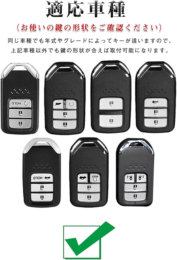 適応車種:ホンダ (HONDA)新型フリード フリード+ ハイブリット・ガソリン / 新型オデッセイ ハイブリット・ガソリン 2013.11~/ ステップワゴン スパーダ e:HEV・ガソリン RP1 RP2 RP3 RP4 / 新型フィット 2013.9~ / S660 / CR-Z 2016年~/ ヴェゼル 2014年~ / CR-V ハイブリット・ガソリン 2019年~/ JADE ジェイド / シャトル ハイブリット・ガソリン / シビック セダン / ハッチバック / タイプR 2015年~/ アコード PHEV・ハイブリット / インサイト 2019年~/ グレイス GM4 / GM5 ハイブリット・ガソリン2014年~/ クラリティ FUEL CELL / PHEV/typeR/RC1/RC2およびその他のモデル(お使いの鍵の形状をご確認ください)※上記車種以外でも鍵の形状が合えば取り付け可能になります。