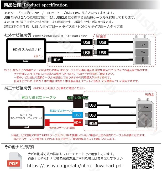 USBケーブルは約60cm HDMIケーブルは1mの長さとなっております。 USB端子は2Aの給電に対応可能なUSB2.0に準拠する高品質ケーブルを採用しております。 またHDMI端子は金メッキ処理により耐腐食性・通電安定性の高い仕様です。 製品コネクタ仕様 「USB Aタイプ雌ーAタイプ雄」 / 「HDMI Aタイプ雌ーAタイプ雄」