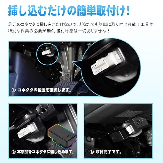 【挿し込むだけの簡単取付け!】足元のコネクタに挿し込むだけなので、どなたでも簡単に取り付け可能!工具や特別な作業の必要が無く、後付け感は一切ありません!
