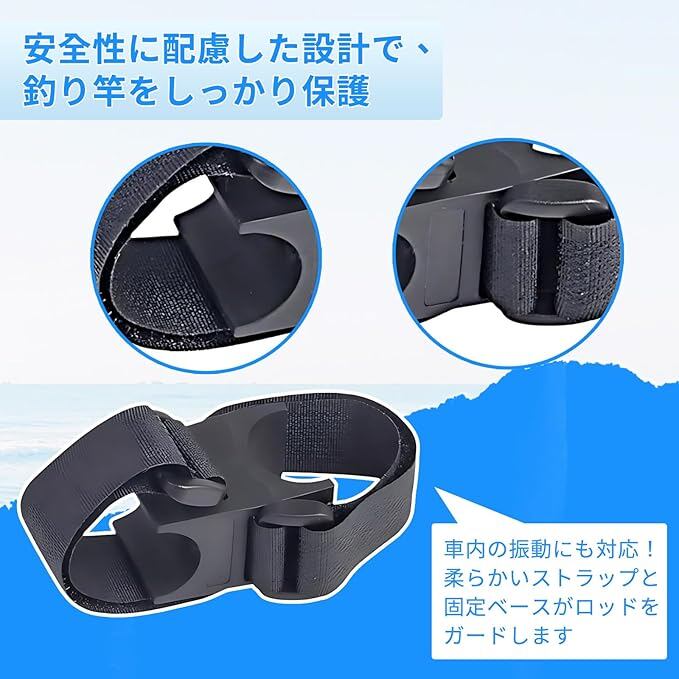 【360 回転台座&ゴムバンド保護】台座は360 回転式で、車内の角度や位置に合わせて自由に調整可能。柔らかいゴム素材が竿の表面を保護し、走行中の振動や揺れにもズレず、異音も発生しません。大切な釣り竿をキズ付けることなく、安定感抜群に固定できます。