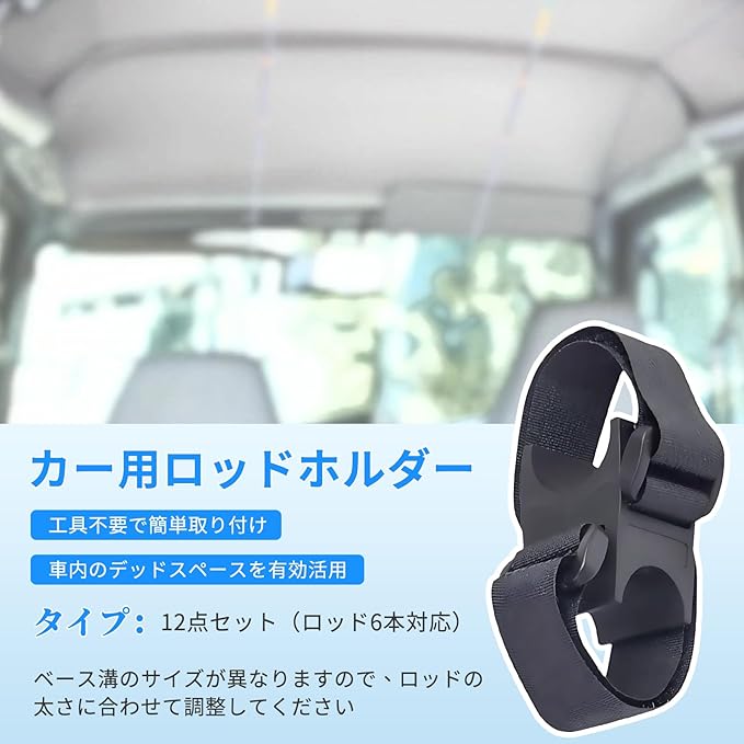 ロッドホルダー 車載 天井収納 釣り竿固定ラック 360 回転台座 ゴムバンド保護 防振 防傷 面ファスナー式 直径40mmバー対応 取付簡単 軽量設計 竿掛けホルダー アウトドア キャンプ 釣り 車内スペース有効活用 12個セット