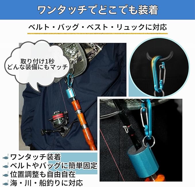【カラビナで簡単装着・幅広い対応】付属のカラビナでワンタッチ取り付けが可能です。ベルト、ライフジャケット、ゲームベスト、リュック、ウエストポーチなど、あらゆる装備に固定できます。装着位置を自由に調整できるため、釣り場の状況や体勢に合わせて最適な位置でロッドを保持することが可能です。カラビナ部分もアルミニウム素材を採用しており、軽量ながら強度が高く、長時間の使用にも耐えます。川釣り、海釣り、湖、管理釣り場、船釣りなどあらゆるシーンに対応し、ライトゲーム、トラウト、アジングなどの軽量タックルに最適です。初心者からベテランまで使いやすい設計です。