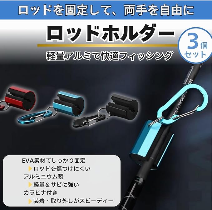 【仕様詳細】〇セット内容:ロッドホルダー3個セット(カラビナ付き)。〇カラー:黒(ブラック)/赤(レッド)/青(ブルー)。〇バリエーション:①黒 3、②赤 3、③青 3、④黒赤青。〇ホルダー部サイズ:約長さ 3.2cm 幅 2.7cm。〇カラビナサイズ:約長さ 5.0cm 幅 2.0cm。〇対応ロッド径:約5〜10mm。〇重量:約14g(1個あたり)。〇素材:アルミニウム+EVA。〇取付方法:カラビナ式(ベルト・バッグ・ベストなどに対応)。※重量、サイズにつきましてはあくまで目安のため若干の誤差が生じる場合がありますのでご了承下さい。※塗装は手作業のため個体差や色ムラが生じる場合がありますが、使用に問題はありません。※商品写真はできる限り実物と近づけるようにしていますが、お使いのモニター設定、お部屋の照明等により実際の商品と色味が異なる場合があります。※海外製品のため日本製のものと比べて細かいところで雑に見えるものや多少の誤差がある場合があります。恐れ入りますが予めご了承ください。