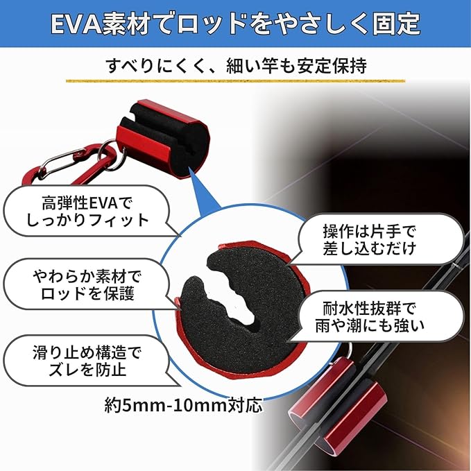 【EVA素材の滑り止め構造】ロッド保持部には高弾性EVA素材を使用し、竿径約5〜10mmのライトロッドや渓流用タックルをしっかり支えます。クッション性が高く、滑りを防ぎながらロッドを傷つけにくい設計です。軽量なスピニングロッドやフライロッドなどにも対応します。内部には溝があり、釣り竿の位置が安定するため、片手で差し込むだけで固定可能です。ルアー交換や糸通しなど細かい動作の際に竿が落ちにくく、操作性を向上させます。さらにEVA素材は耐水性に優れ、雨天や潮風にも強いです。アウトドア環境下での耐久性を重視するアングラーに最適です。