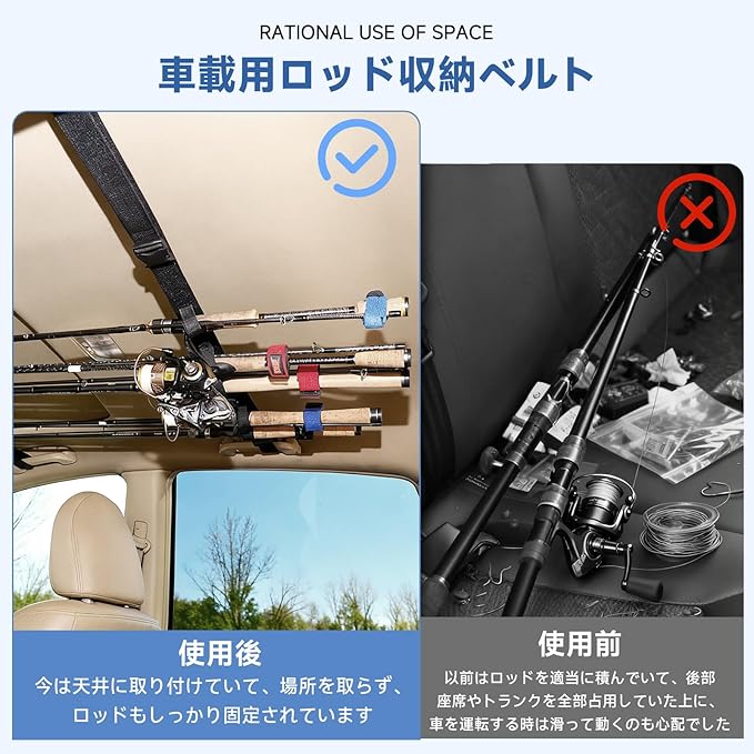 【車内スペースを有効活用】天井に取り付ける設計のため、後部座席に友達を快適に乗せられ、トランクに钓具ケースやピクニックマットを収納しても狭くなりません。家族で釣り出行する際、家族がゆったり座れるだけでなく、荷物もスムーズに収まり、ロッドと荷物のどちらを優先するか悩む必要がなくなります。