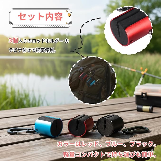 【セット内容】3個入りのロッドホルダー カラビナ付きで携帯便利。カラーはレッド、ブルー、ブラック。軽量コンパクトで持ち運びも簡単。