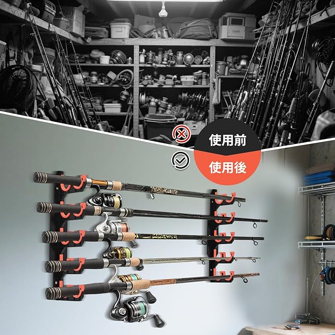 【省スペース壁掛け設計】床置きスペースを一切使わない、画期的な壁掛け式のロッドスタンドです。コンパクト設計でガレージや船倉の狭い壁面にぴったり収まり、最大10本の釣り竿をスッキリ整理。散らばった釣り竿に悩むことなく、必要な時にすぐ取り出せる便利さで、毎日の釣りがより快適になります。