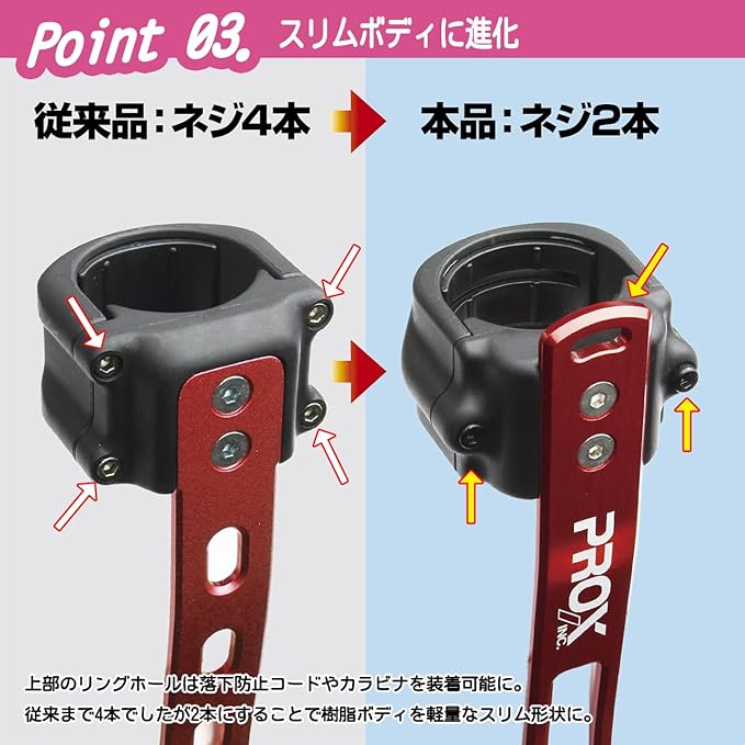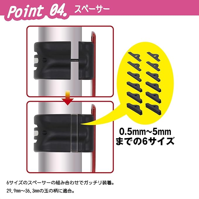 ホルダー部は2本ネジでしっかり固定し、付属スペーサーで元竿の締め過ぎ変形を防止します。
