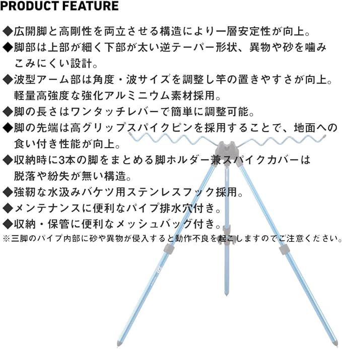 ・脚部は上部が細く下部が太い逆テーパー形状、異物や砂を噛みこみにくい設計 ・収納時に3本の脚をまとめる脚ホルダー兼スパイクカバーは脱落や紛失が無い構造 ・強靭な水汲みバケツ用ステンレスフック採用 ・メンテナンスに便利なパイプ排水穴付き ・収納・保管に便利なメッシュバッグ付き