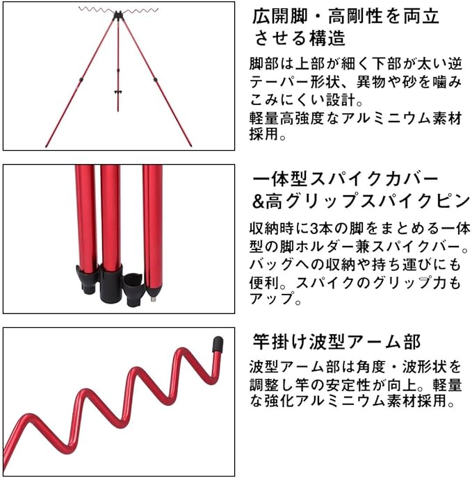 【広開脚・高剛性を両立させる新構造】 波型アーム部は角度・波形状を調整し竿の置きやすさが向上。 軽量高強度な強化アルミニウム素材採用。 【一体型スパイクカバー&新形状スパイク】 収納時に3本の脚をまとめる一体型の脚ホルダー兼スパイクカバー。 バッグへの収納や持ち運びにも便利。新形状スパイクでグリップ力もアップ。 【竿掛け波型アーム部】 波型アーム部は角度・波形状を調整し竿の安定性が向上。軽量な強化アルミニウム素材採用。