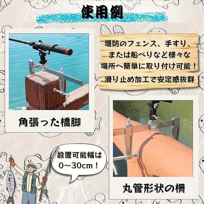 堤防のフェンス、手すり、または船べりなど、様々な場所へ簡単にしっかりと取り付け可能です。滑り止め加工が施されているため、ぐらつきを抑えて安定した釣りを実現します。