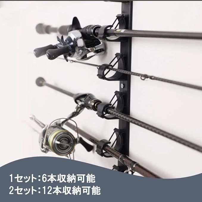 【商品詳細】 ■収納本数 1セット:最大6本 2セット:最大12本 ■サイズ:約42cm 約3.3cm 約4.9cm ■重量:118g ■対応ロッド径:最大約20mm ■素材:ABS樹脂