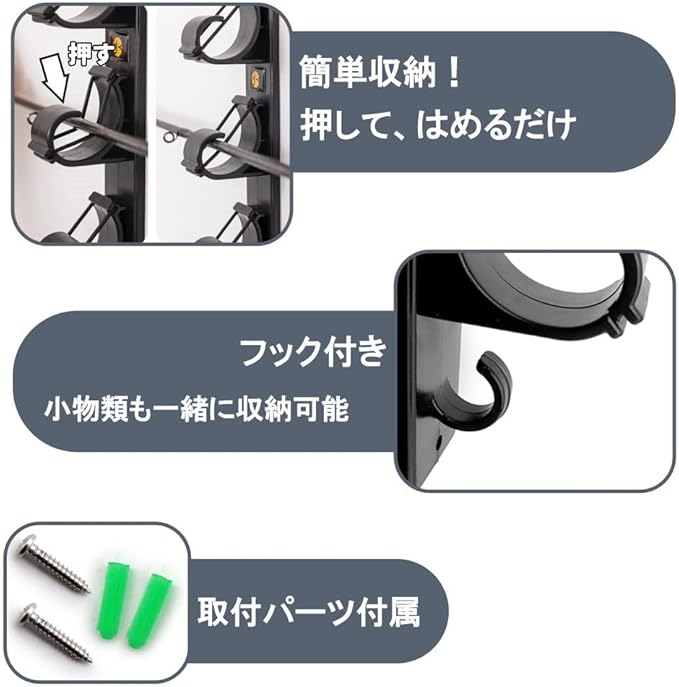 【省スペース&しっかり収納】 最大6本の釣り竿を収納できる、壁掛け・天井取リ付け対応のロッドホルダー。 限られたスペースを無駄なく活かし、釣り道具をスッキリ収納できます。 ガレージ、物置、釣具部屋に最適!