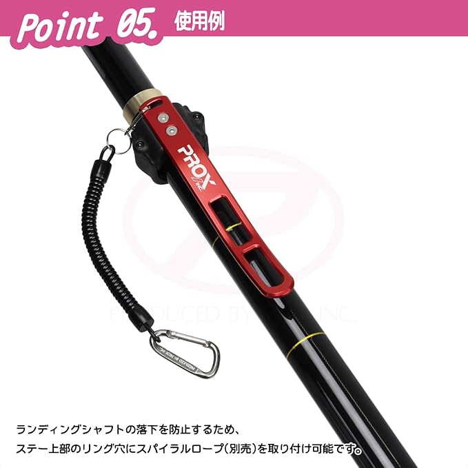 上部リングホールには落下防止コードやカラビナを装着可能。Sサイズは直径23.6~30.0mmに対応し、幅広い玉の柄への取り付けが可能です。