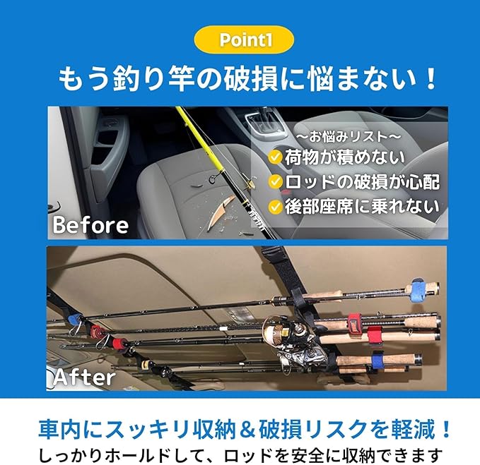 【車内にスマート収納!大切な釣り竿をしっかり保護】釣り好きには欠かせないロッドの持ち運び。車内天井に取り付けるだけで、最大5本の釣り竿をしっかりホールド。移動中の揺れや落下を防ぎ、大切なタックルを安全に守ります。ロッドへの傷つきや圧迫ダメージを最小限に。愛用の竿をいつまでも美しく保ちたいアングラーに最適な仕様です。