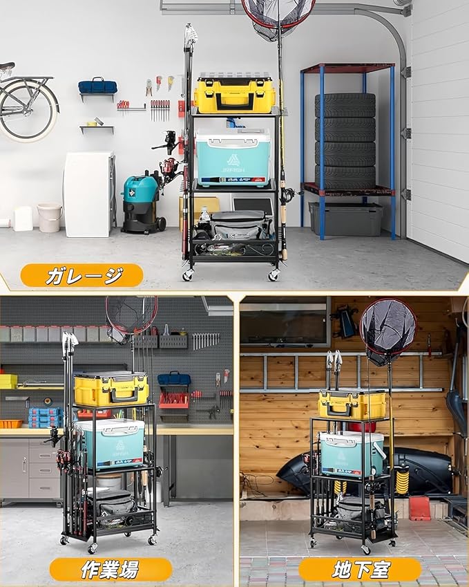 【多様な釣り道具や収納ボックスに対応】Jumeiロッドスタンドは、3段の大容量設計を採用しており、さまざまな釣り道具や収納ボックスを簡単に収納できます。大型の釣り具から小さなアクセサリーまで、多くのアイテムをしっかりと整理できるため、釣り好きの方には欠かせないアイテムです。空間を最大限に活用し、必要なものをすぐに取り出せる便利な設計です。