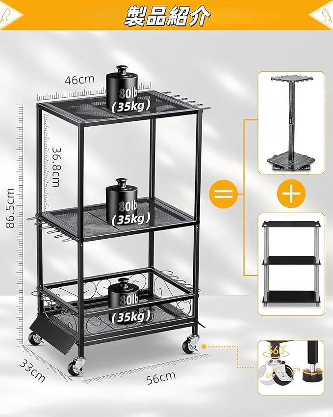 【360 回転キャスター付きで移動がスムーズに】360 回転する万向キャスターが搭載されており、簡単に移動ができ、ブレーキ機能も備えています。使いたい場所に簡単に移動できるので、室内での使用はもちろん、外での使用にも便利です。移動後は、ブレーキをかけてしっかりと固定できるため、安全に使用することができます。