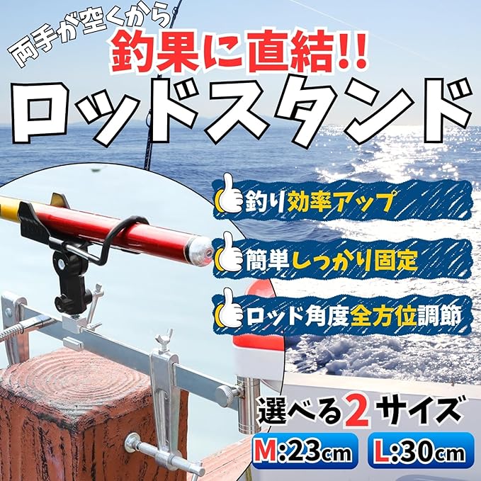 【快適な釣り体験をサポートする竿スタンド】 堤防釣りや船釣り、投げ釣り、サビキ釣りなど、さまざまなシーンで活躍する「釣り竿 ロッド スタンド」。釣りをしている最中、竿を置く場所がなくて困った経験はありませんか? 本商品は汎用タイプの竿立てで、堤防や船の手すりなどにしっかりと固定できるので、釣り人の大きな悩みである「竿の落下防止」に効果的です。竿置きの位置を安定させることで、竿を握り続ける疲れから解放され、快適に釣りを楽しめます。特に長時間の餌釣りや投げ釣りでは、竿受けがあるかどうかで集中力と成果が大きく変わります。釣行の質を高める必須アイテムです。 【耐久性と安心の設計】 本ロッドホルダーは、ステンレスとアルミを採用した頑丈な構造。耐錆性に優れ、潮風や海水にさらされる海釣りでも長期間安心して使用できます。樹脂パーツを適所に使用しており、竿本体を傷つける心配もありません。軽量設計ながら強度抜群で、23cmのMサイズと30cmのLサイズを用意。使用シーンやお手持ちの釣竿に合わせて選べるのも魅力です。また、工具不要で簡単に取り付けできるクランプ式を採用。ロッドキーパーとしての役割を果たしつつ、初心者からベテランまで誰でもすぐに使える手軽さもポイントです。 【調整可能で汎用性抜群】 釣り場や状況に応じて角度調整が可能なため、竿の位置を自由に変えられます。堤防釣りではしっかり固定して安定感を、船釣りでは揺れに対応した角度を確保するなど、場面ごとの最適なポジションで使用可能です。竿置きとしての基本機能はもちろん、細かい調整ができることで効率的にアタリを見逃さず、釣果アップにも直結します。クランプ幅が広めに設計されているため、厚みのある堤防や船の手すりにも取り付けやすく、まさに汎用性の高さが売り。釣竿の種類を選ばず幅広い釣り道具に対応できるので、これ一つであらゆるスタイルの釣りに対応できます。 【理想の釣りを叶えるベストパートナー】 「便利」「軽量」「頑丈」と三拍子揃った竿立ては、釣りの時間をより楽しく、効率的にしてくれます。両手が空くことで餌の準備や仕掛けの調整がしやすくなり、初心者でも安心して釣りに集中可能。落下防止の安心感と固定力で、大切な釣竿を守りつつ、快適な環境を提供します。釣りという趣味をより深く楽しむために、このロッドホルダーは必須の釣り道具。堤防釣り、船釣り、投げ釣り、サビキ釣り、餌釣りと幅広いスタイルを支え、あなたの理想の釣行を現実にしてくれるアイテムです。 【商品内容】クランプ固定幅: Mサイズ0~23cm、L サイズ0~30cm 【注意事項】 ・弊社の商品につきましては、30日間の返品・返金保証がついてございます。1つ1つ丁寧に検品しておりますが、万が一商品の初期不良・不具合や破損等ございました際には、大変お手数ではございますがAmazonカスタマーサポートよりお問い合わせくださいませ。 ・ご覧のモニター環境により実物と色味が異なって見える場合がございます。 ・取扱説明書は付属しておりません。 ・取付方法や適合の可否のサポートついては弊社では承っておりません。 ・海外製品のため製造工程でのわずかな色ムラやバリ等が見られる場合がございます。