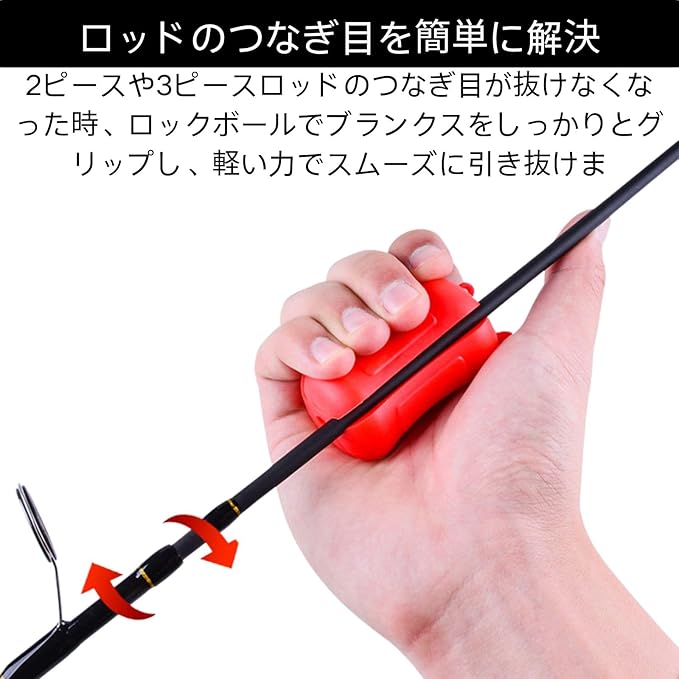 ロッドのつなぎ目を簡単に解決:2ピースや3ピースロッドのつなぎ目が抜けなくなった時、ロックボールでブランクスをしっかりとグリップし、軽い力でスムーズに引き抜けます