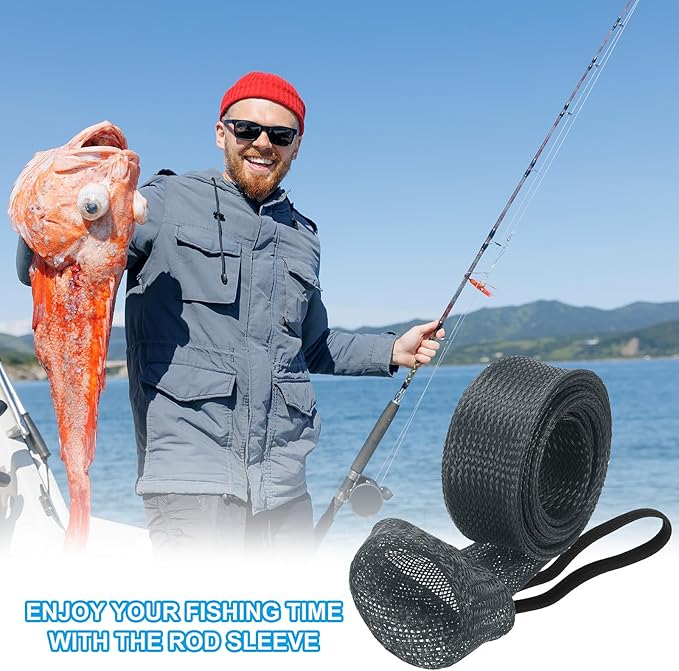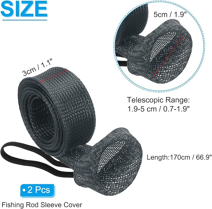 サイズ:170x3 cm/66.9x1.1"(長さ 幅);伸縮範囲:1.9-5 cm/0.7-1.9";パッキングリスト:2個 x 釣りロッドスリーブカバー