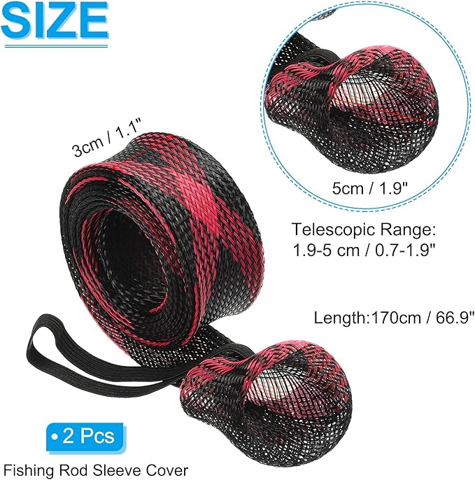 サイズ:170x3 cm/66.9x1.1"(長さ 幅);伸縮範囲:1.9-5 cm/0.7-1.9";パッキングリスト:2個 x 釣りロッドスリーブカバー