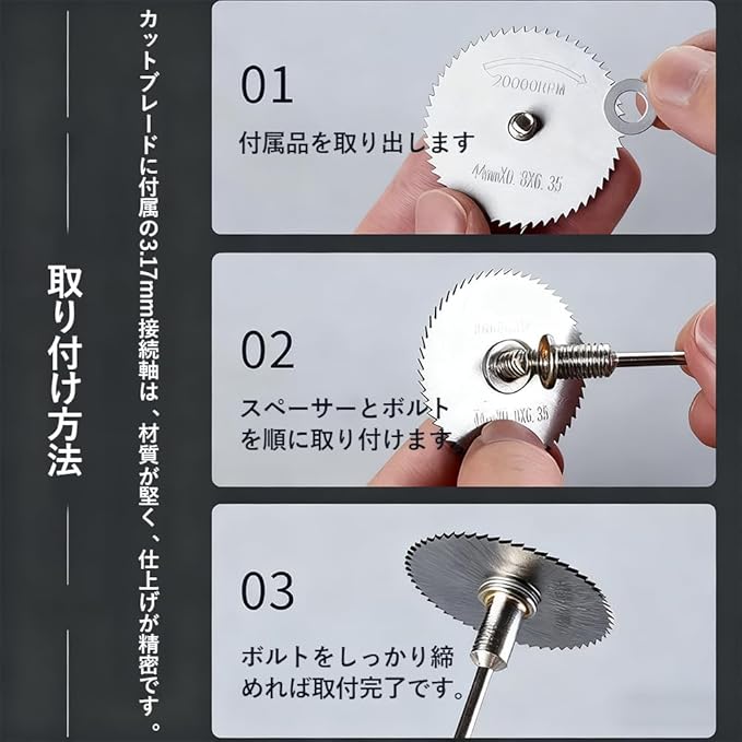 【安全なご使用のために】ご使用時は保護手袋とゴーグルの着用を必ずお願いいたします。回転速度は20000rpmを超えないように設定し、材料はしっかり固定して作業してください。六角シャンクは確実に締め付けてご使用ください。