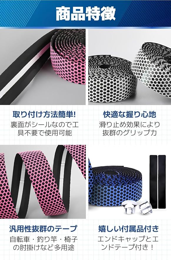 【商品特徴】①取り付け方法簡単!:裏面がシールなので工具不要で使用可能/②快適な握り心地:滑り止め効果により抜群のグリップ力/③汎用性抜群のテープ:自転車・釣り竿・椅子の肘掛けなど多用途/④嬉しい付属品付き:エンドキャップとエンドテープ付き!