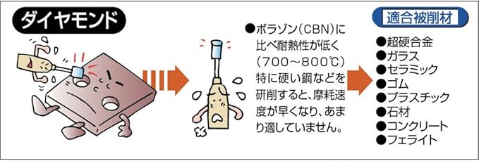 ●刃径 刃長 全長:1.6 7.0 44.5mm●粒度:#140●角度:6.7 ●軸径:3mm●適合被削材:超硬合金、ガラス、セラミック、ゴム、プラスチック、石材、コンクリート、フェライト、その他非鉄金属。●乾式での使用は可能ですが、研削液を使用すれば精度・仕上がりが良くなり、切れ味・寿命も向上します。●形の良い天然ダイヤモンドを厳選使用しています。独自の電着技術により、ダイヤモンド粒子は強固に固着されており超寿命を誇ります。●加工時間の大幅短縮を実現します。●豊かな仕上げ能力です。