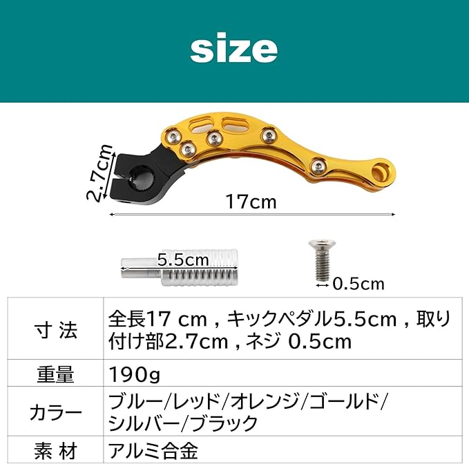 サイズ(約): 本体全長17cm, キックペダル部分5.5cm, 取り付け部分2.7cm,ネジ0.5cm