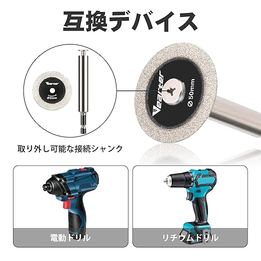 パッケージ内容 - 直径50mm ダイヤモンドカッティングディスク 5枚入、6.35mm六角シャンク リ1個
