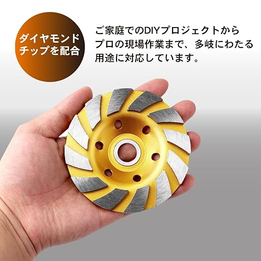 【高品質のダイヤモンド粒子を使用】ダイヤモンドカップサンダーは、コンクリートやモルタル、タイル、レンガ、瓦などの素材を効率よく磨くのに最適です。また、金属のバリ取りやガーデニングでの花壇整備など、さまざまな作業で威力を発揮します。高品質のダイヤモンド粒子を使用しており、長時間にわたる使用でも摩耗が少なく、耐久性が保証されています。