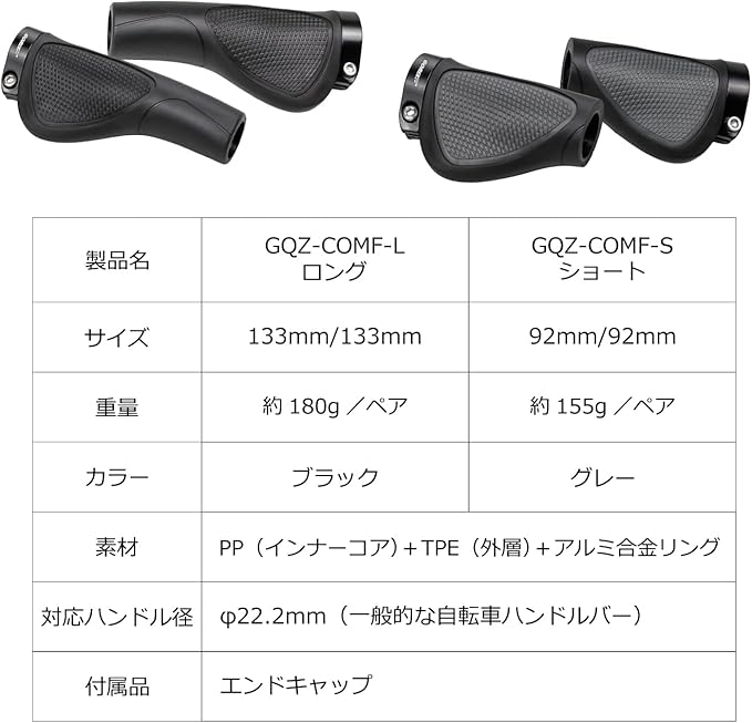 【選べる2サイズ!あなたの自転車と手に最高のフィット感を】 GQZ-COMF-L(133mm・約180g):ロングサイズで、手の大きい方やツーリング・MTB・クロスバイクのハンドルに最適。 GQZ-COMF-S(92mm・約155g):ショートサイズで、変速機(シフター)付きの日常使いの自転車(シティサイクル、ママチャリ)に乗っていて、手の疲労を減らしたい方などに最適。