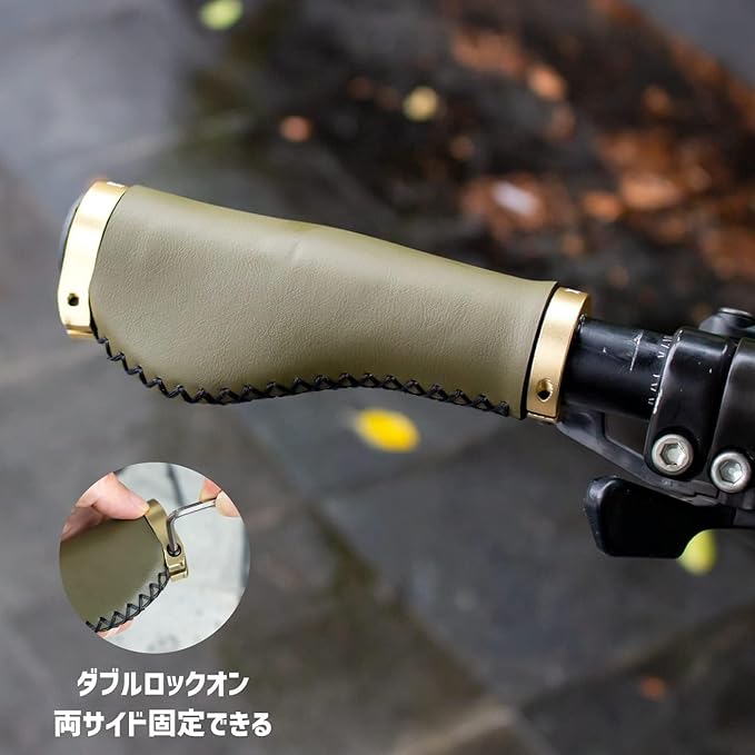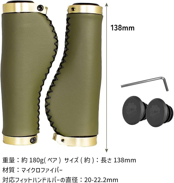 【商品内容】:自転車グリップ、エンドキャップ、取付け六角工具【サイズ】:長さ138mm【材質】:マイクロファイバー【正味重量】:約180g(ペア)【カラー】:オリーブ