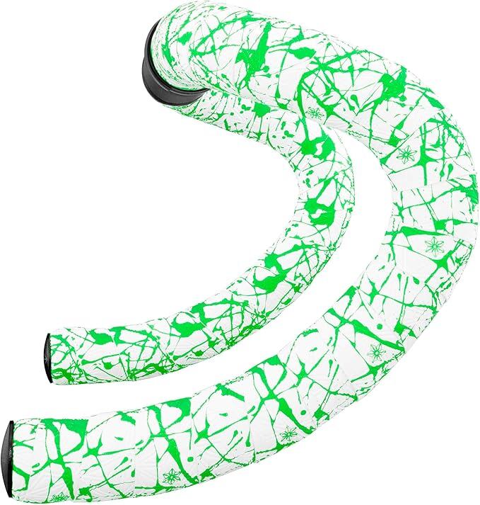 Supacaz Bartape - スーパースティッキークッシュ - スプラット - リミテッド- ホワイト/ネオングリーン + ブラックスタープラグ - サイクリングハンドルバーテープ