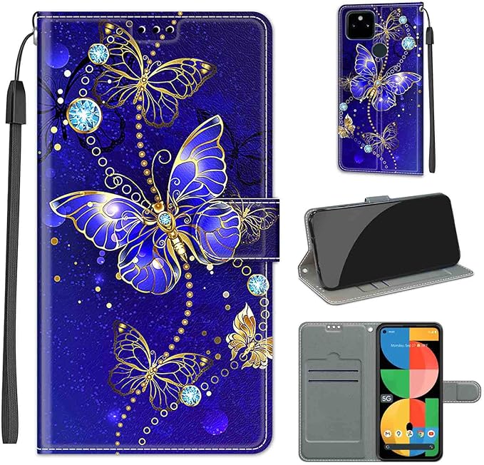Google Pixel 5a 5Gケース 手帳 Pixel 5A5Gケース手帳型 Pixel5a5G手帳型ケース Pixel 5a 5gスマホケース 携帯ケース カバー case スマホケース 携帯カバー 財布型 カード収納 マグネット式 スタンド機能 ストラップホール付き 薄型 360度保護 耐衝撃 高質感 (Google Pixel 5a 5G対応) 青い蝶