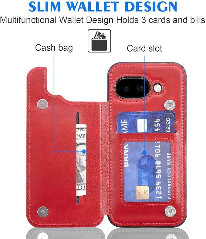 【Geshh】Pixel 9A docomo au Softbank レザーケース(レッド)耐衝撃 財布型カバー カード収納 横置きスタンド機能 開閉式 ストラップ付き 薄型レザーケース 対応 グーグル ピクセル9a pixel9a ソフトバンクpixel9a RED