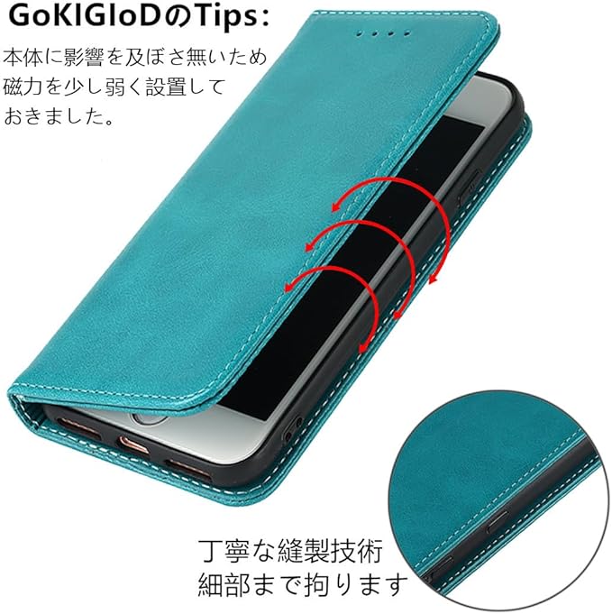 【機能性②】:マグネット内蔵のタイプです、使用上、指への支障も無くなって、一見からするととてもシンプルな感じがします。精密な縫製技術を重ねて出来上がった手帳型で、二重カバーのデザインにより、大切な携帯をキズ、汚れ、衝撃からしっかりと保護できます。
