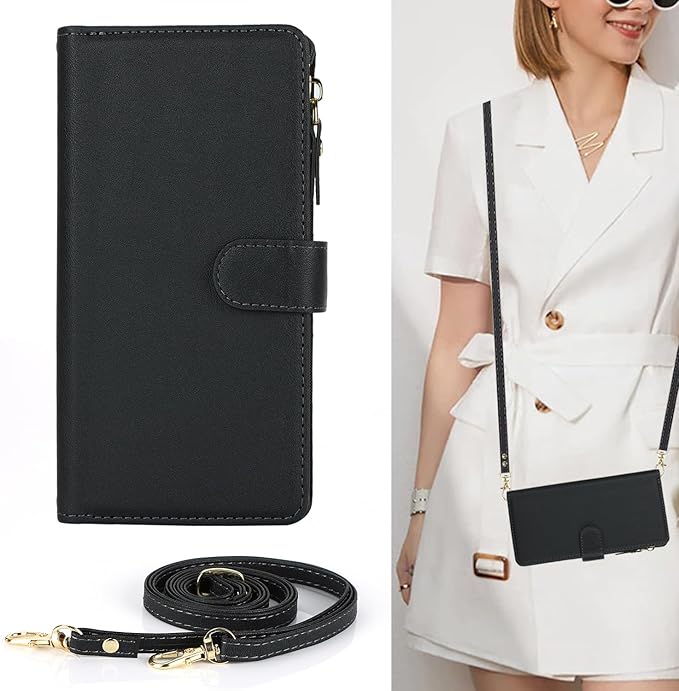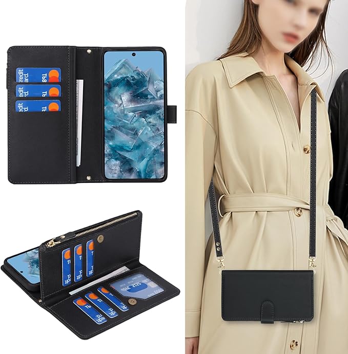 Eastwave for Google Pixel 8 Pro ケース for pixel 8pro 縄掛けケース for Google Pixel8 Pro 手帳型 財布型 ICカード コインポケット ストラップ付き カード 収納 小銭入れ ファスナーポケット付き PUレザー 6色 ブラック