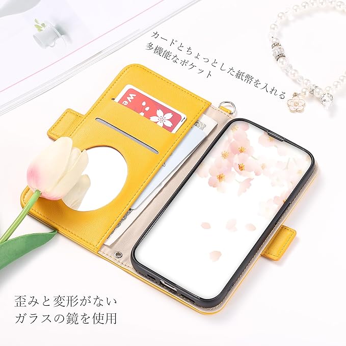 歪みと変形がないようにガラスの鏡を使用、ちょっとしたお化粧直しも便利です(高い所から落ちる場合は鏡が割ることがありますので、ご注意ください)。内側にカードポケットX2枚を入れ、さらに大きいサイドポケットも用意し、メモや小口の現金を挟み込めます。手帳型スマホケースをお持つだけお出かけに十分です。