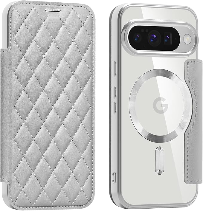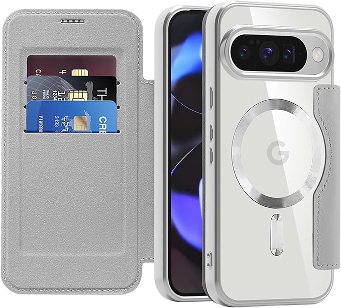 Google Pixel 10 /10 Pro用 ケース RFID 手帳型 財布型 背面透明 Magsafe対応 カードポケット付き ピクセル10 /10 Pro 用 携帯カバー カード収納 スマホケース 高級レザー 耐衝撃 全面保護 (クリア,グレー)