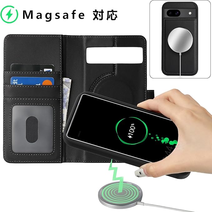 Havaya Google Pixel 8a ケース 手帳型 MagSafe 対応 ピクセル8a ケース カード収納 マグセーフ対応ケース 耐衝撃 全面保護 フェイクレザー 【分離式2in1】スタンド機能 ワイヤレス充電対応-ブラック