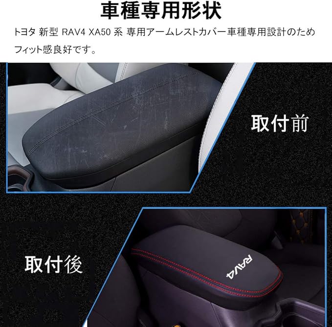 【車種専用形状】トヨタ 新型RAV4&RAV4 PHV 専用 アームレストカバー、 XA50系に対応、車種専用設計のためフィット感良好、実車にフィッティングを確認した内装パーツです、違和感なくぴったりフィットします、アームレストの使用には影響しません。