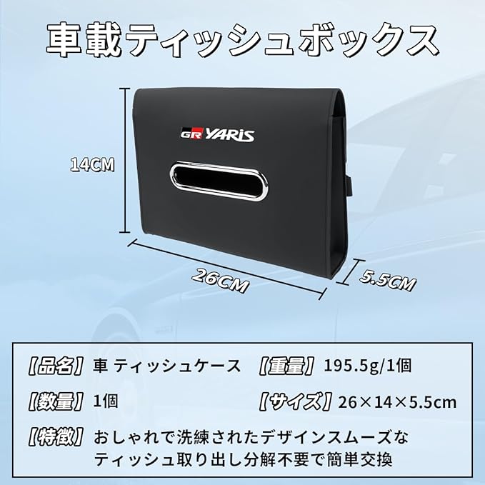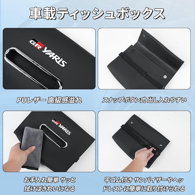 GR ヤリス カー ティッシュボックス PUレザー 吊り下げ式ティッシュホルダー サンバイザー/ヘッドレスト/アームレスト/インストルメントパネル/後部座席 隠し式スナップボタン付き 対応 GR YARiS 専用ロゴ 厚さ7CM 車 ティッシュカバー GR ヤリス 10系 RZ RC 車 ティッシュ収納ケース 便利グッズ アクセサリー 内装パーツ